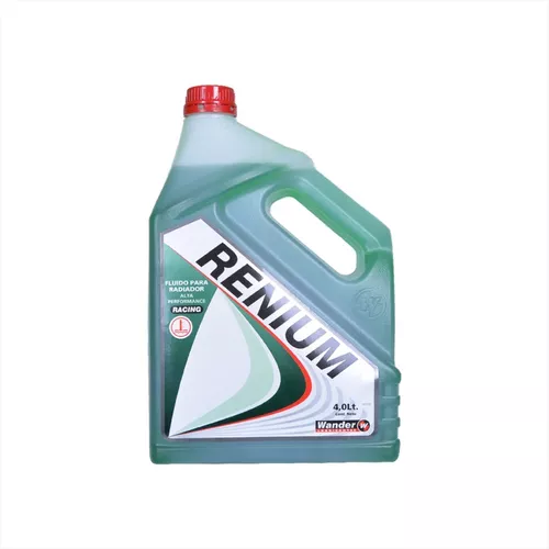 Fluido para radiadores de vehiculos de competición. elaborado con agua desmineralizada obtenida a través de un doble proceso de ósmosis inversa con una cantidad de partículas menor a 1ppm y un Ph 7 +/- 0.5. Comparado con un refrigerante que contenga al menos el 10% de aditivo anticongelante. Renium Racing es hasta un 12% más efectivo en la disipación de calor generado en el motor.
