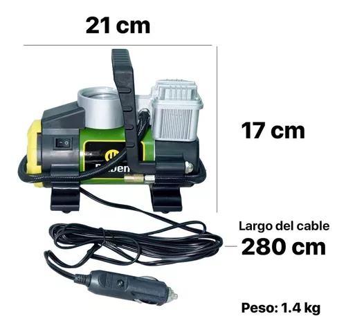 Voltaje: 12V Al ser portátil, podrás trasladarlo fácilmente. Presión máxima de 150psi. Pesa 1700g. Posee un caudal de aire de 30l/min. Potencia tus herramientas neumáticas y facilita múltiples tareas manuales.