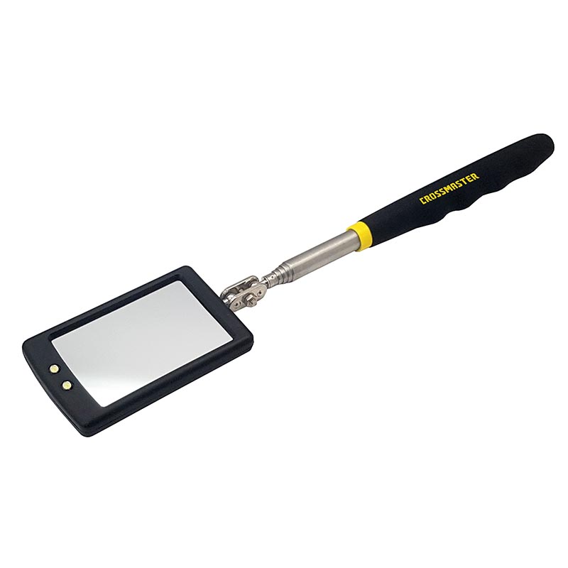 El espejo de inspección rectangular telescópico tiene dos luces LED para auto inspección de partes difíciles de visualizar.