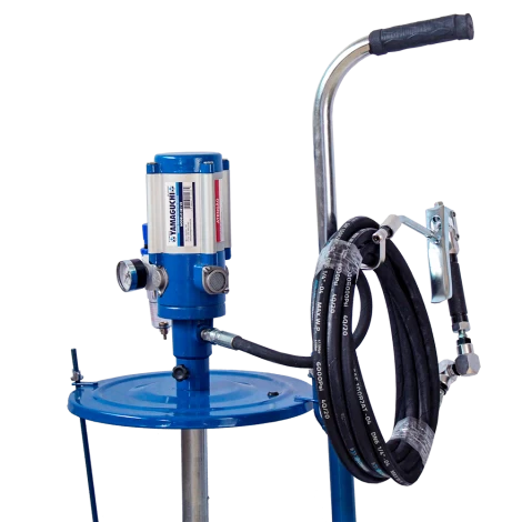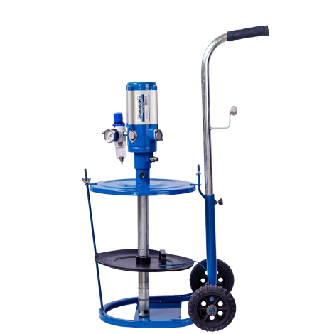Su operación es completamente neumática, eliminando el esfuerzo manual. El alto rateio 50:1 garantiza la presión necesaria para la lubricación de maquinaria industrial y agrícola. El disco rascador asegura el aprovechamiento total de la grasa dentro del balde.