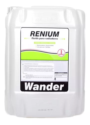 Fluido refrigerante para radiadores de vehiculos. elaborado con agua desmineralizada obtenida a través de un doble proceso de ósmosis inversa cuya cantidad de partículas menor a 1ppm y un Ph 7 +/- 0.5 evitan la formación de sarro e incrustaciones. Comparado con un refrigerante que contenga al menos 10% de aditivo anticongelante. Renium es hasta un 12% más efectivo.